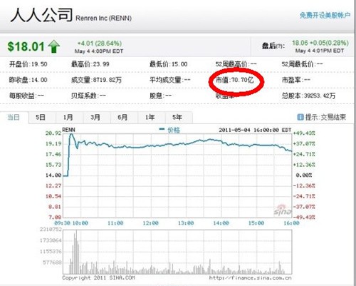 而美国时间5月4日,人人公司以14美元的发行价在纽交所成功IPO,首日交易大涨28.64%至18.01美元,市值70.7亿美元,并一度超越新浪,成为在美上市公司市值次于百度的第二大公司。
