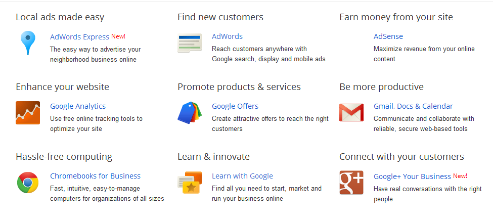 在结构上,Google设置了商务解决方案(Business Solutions)页面,可以以此为中心辐射至所有商业及相关产品线。在页面中针对产品特点与功用,从用户需求角度进行了类别的划分。