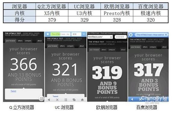 从以上测试得分来看,新版Q立方浏览器拔得头筹说明其X5内核经过优化之后,已经显示出对HTML5强大的支持能力,其他做对比的浏览器如UC浏览器的U3内核、欧朋浏览器的Presto内核虽然HTML5测试得分落后于X5内核,但也都表现不错。