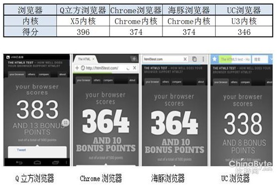 在Android4.0上,Q立方浏览器以396分位居第一,海豚由于调用的是Chrome内核因此和Chrome浏览器得分一样都是374分,UC浏览器以346分位居最后。