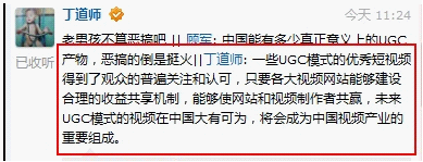 本人也在此截图放出了丁道师对于视频行业如何吸引UGCer的做法,他在微博中说提到的就是“互利共赢机制”。淘宝网赚一块钱,让淘宝店家赚9块钱,吸引了千万淘宝店铺入驻从而铸就了电子商务的传奇,这些都是活生生的例子,最为关键的是考虑网站给用户带去得“利”。